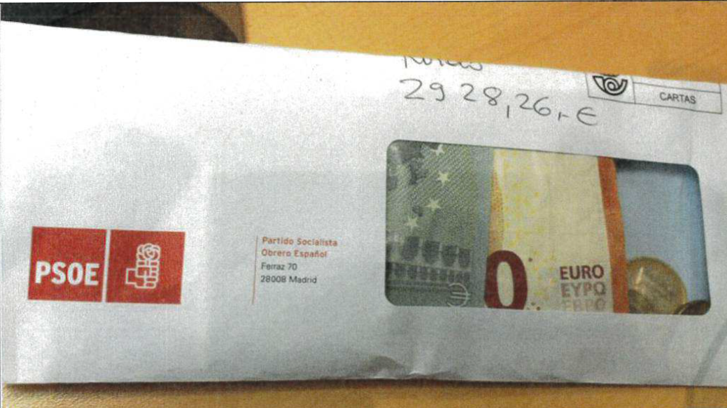 Un dos exemplos que sinala a UCO é un sobre dirixido a Ábalos recollido por Koldo García en xuño de 2019, que segundo o comunicado polo PSOE debería conter 321,29 euros en efectivo, procedentes da caixa, e que segundo a cifra manuscrita na imaxe do sobre con selo do PSOE contería en cambio 826,73 euros, polo que diferenza ascendería de 505,44 euros.
