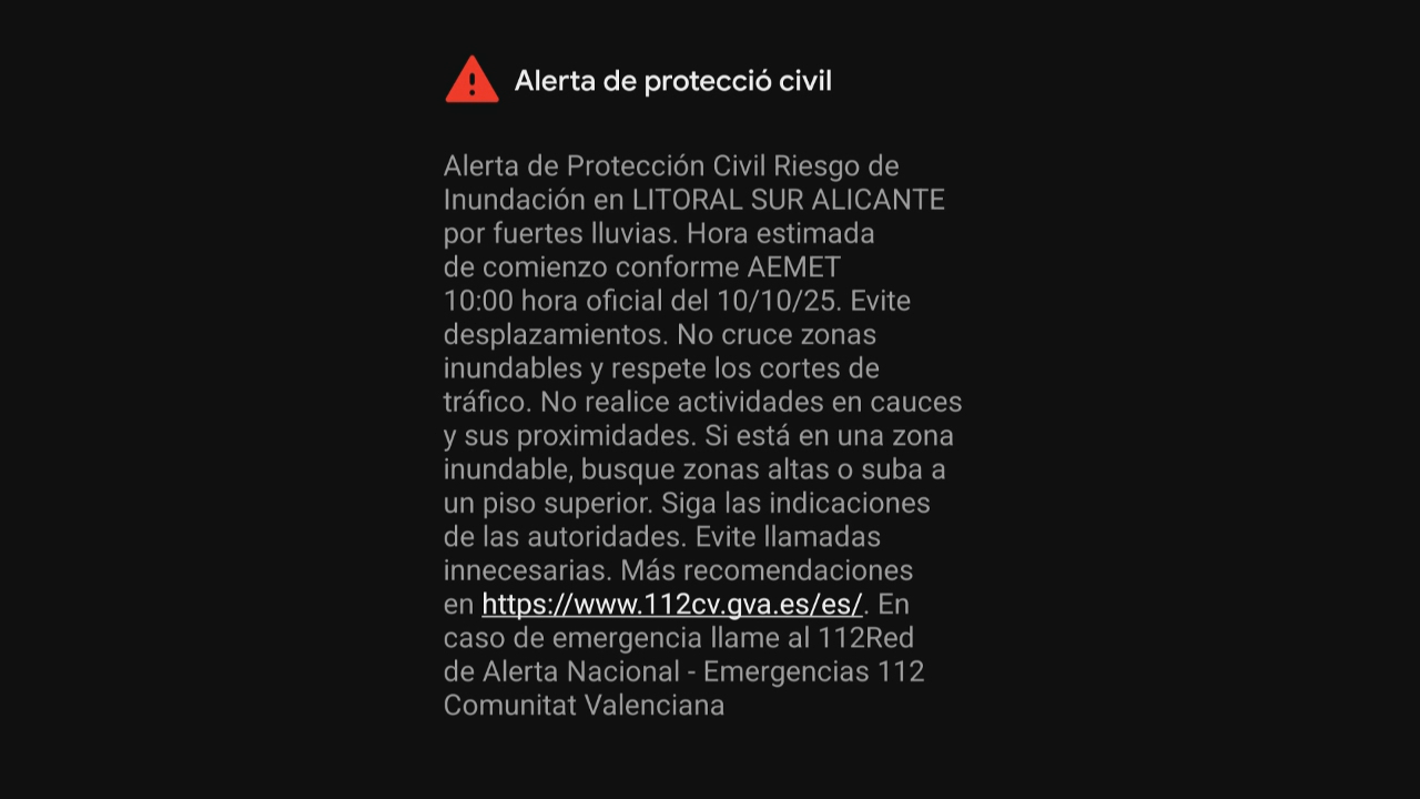 Os teléfonos móbiles da poboación de diferentes zonas da provincia de Alacante recibiron ás 14:47 horas deste xoves unha mensaxe masiva É-Alert de Protección Civil por risco de inundacións a partir das 10:00 horas deste venres no litoral sur desa provincia.