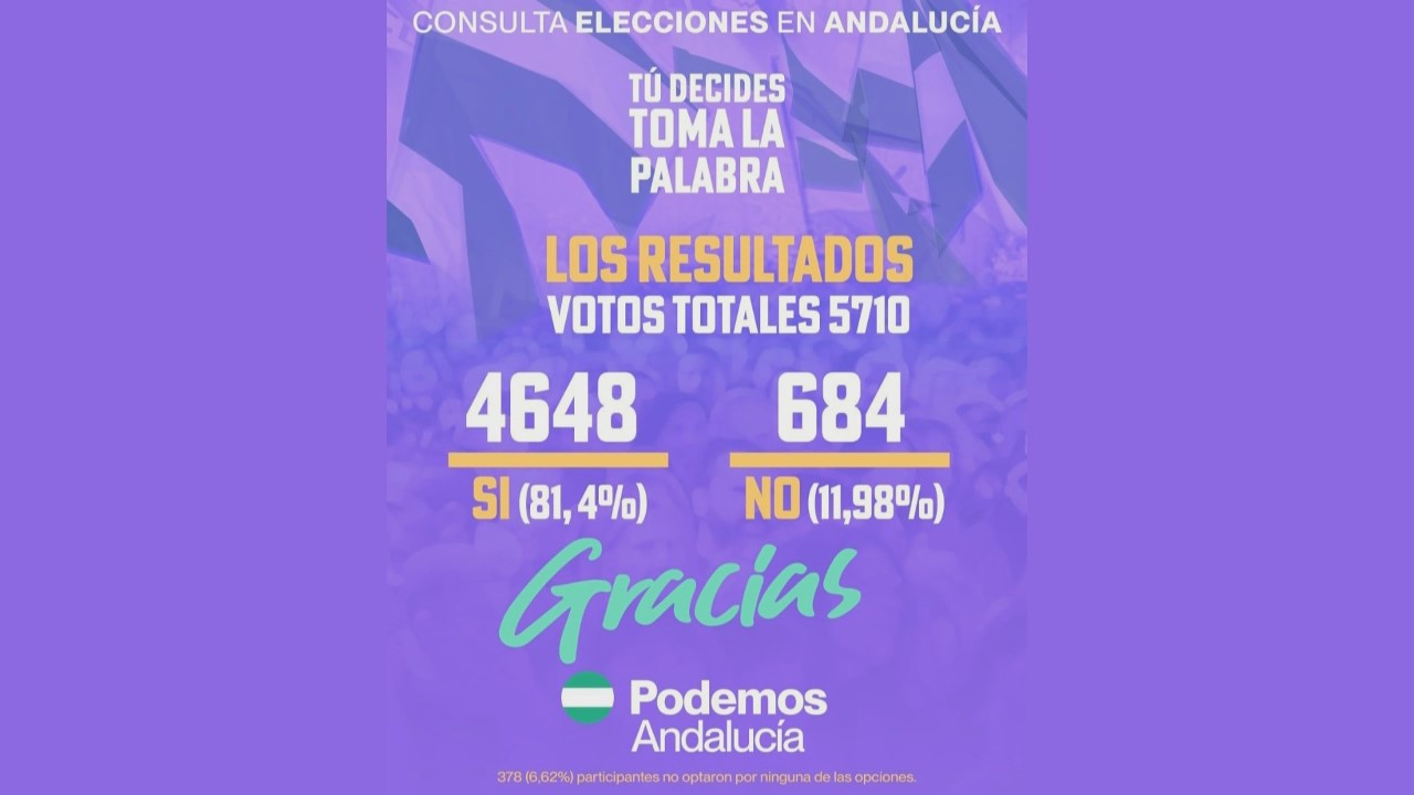 Os inscritos de Podemos na comunidade andaluza votaron afirmativamente á proposta da dirección de chegar a un acordo para integrarse na coalición de esquerda Por Andalucía para as eleccións rexionais do 17 de maio, que encabezará o coordinador xeneral de EU, Antonio Maíllo.