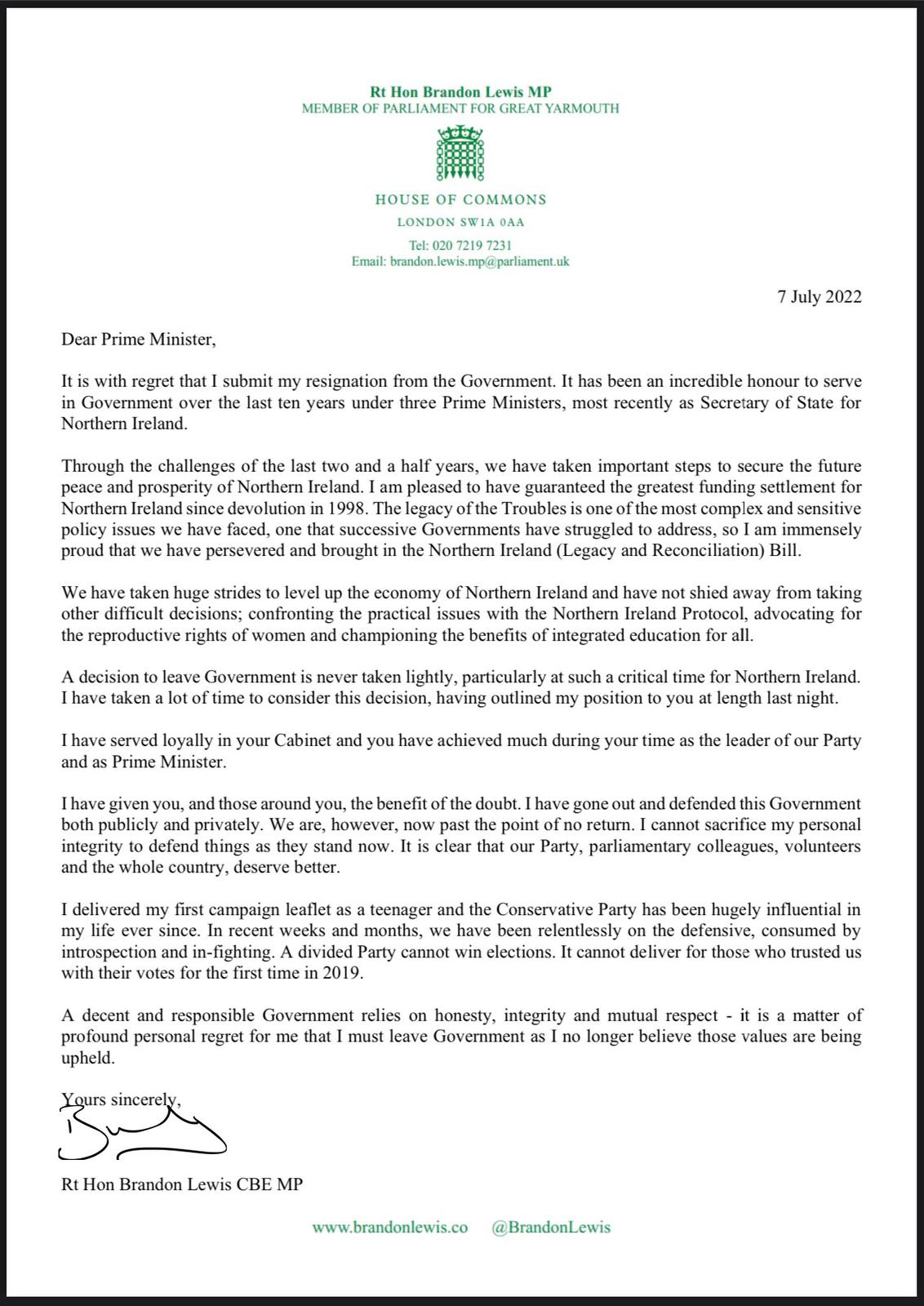 Lewis, ministro clave do gabinete de Johnson, dixo que "lamentaba profundamente" deixar o Goberno pero que deste se espera "honestidade, integridade e mutuo respecto".