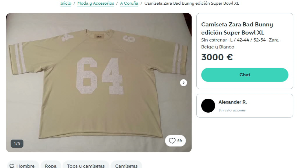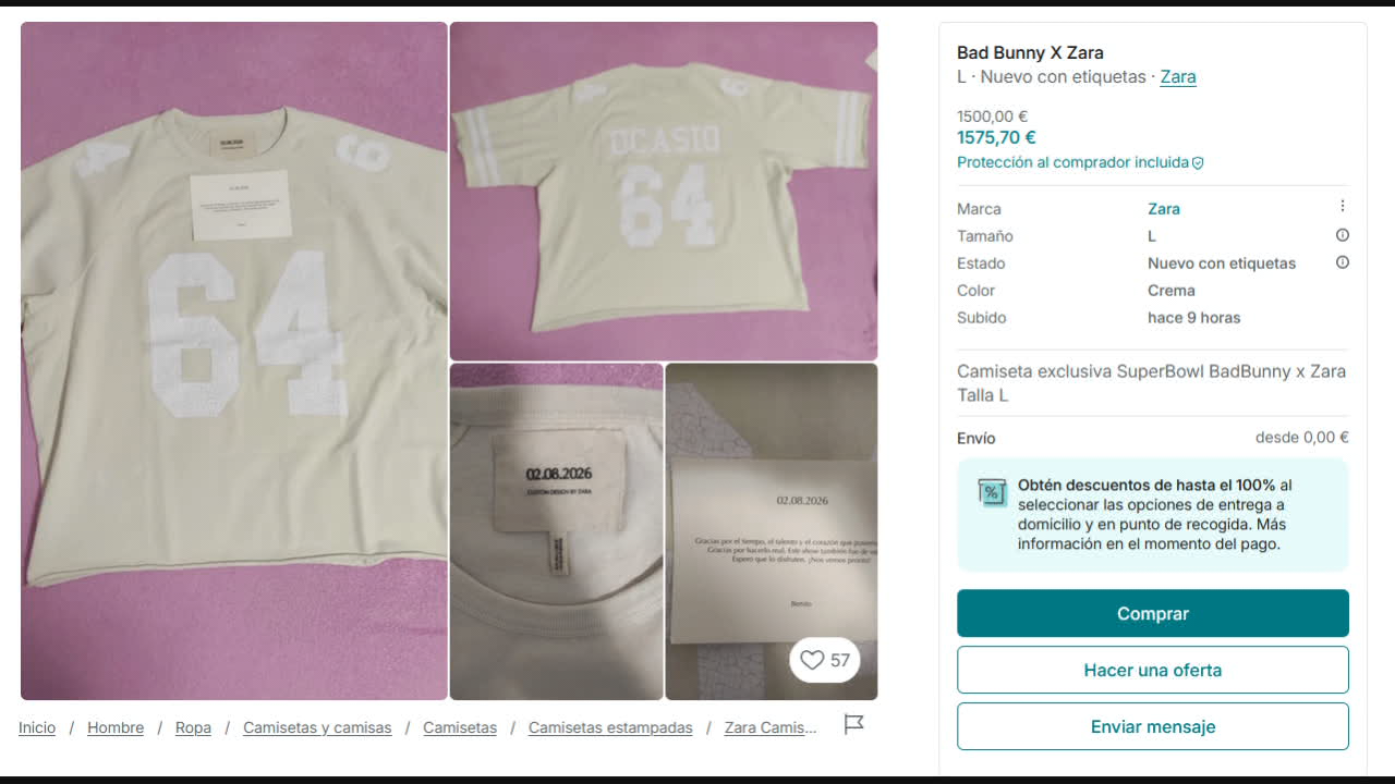 Camisetas iguais ás que o cantante portorriqueño Bad Bunny lles regalou este luns aos empregados de Zara na sede central de Inditex saíron á venda, tarxeta de agradecemento incluída, en plataformas de compravenda por Internet por prezos que oscilan este martes entre os 490 euros e os 30.000 euros.