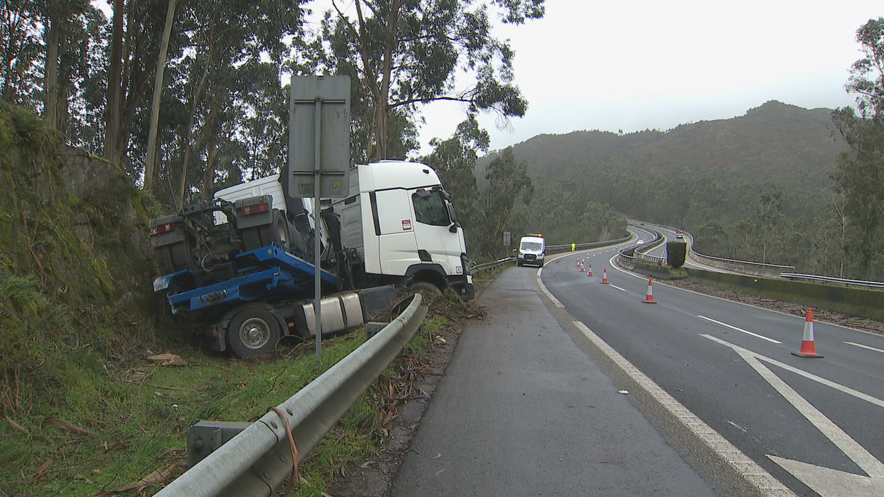 Un carril da AG-57, ao seu paso por Vincios, en Gondomar, permanece pechado ao tráfico tras saírse da vía un camión e envorcar. Con todo, non se rexistraron feridos.