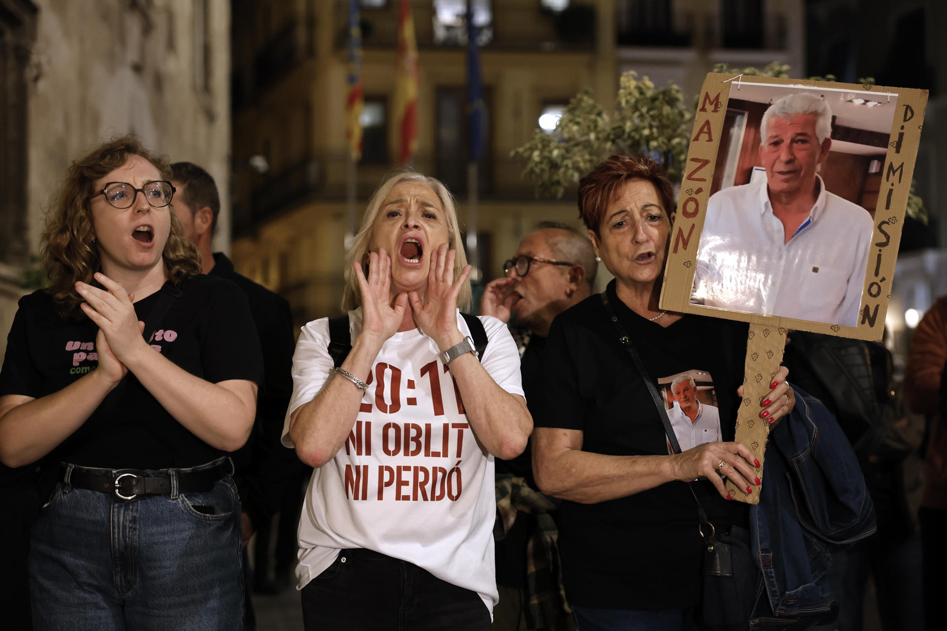 Decenas de persoas, a maioría familiares de persoas falecidas na DINA do 29 de outubro de 2024, concentráronse na tarde deste domingo diante do Palau da Generalitat para pedir a dimisión do president valenciano, Carlos Mazón.