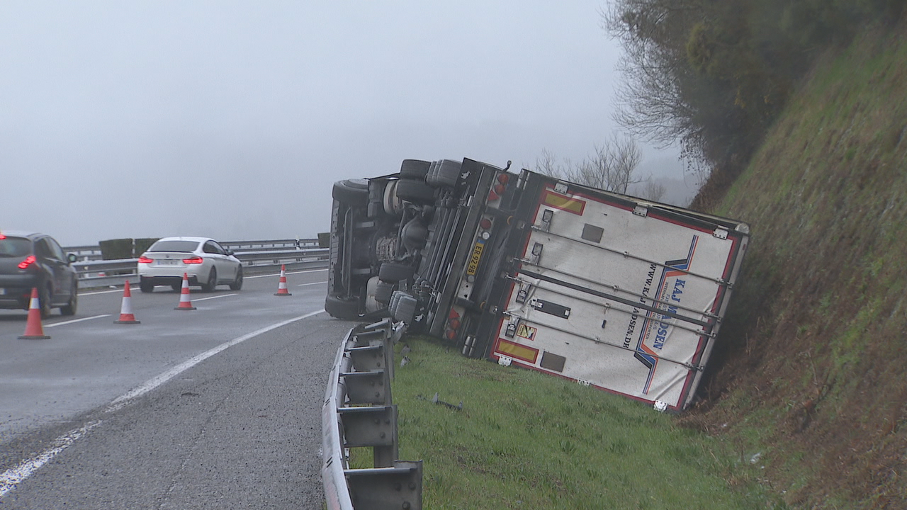 Na A-6, en Baralla, traballan para retirar o camión que envorcou na vía na mañá do domingo. O tráfico dirección A Coruña está a ser desviado pola Nacional VI. Primeiro descargouse o vehículo que transportaba produtos cárnicos e a carga trasladouse a outro camión.