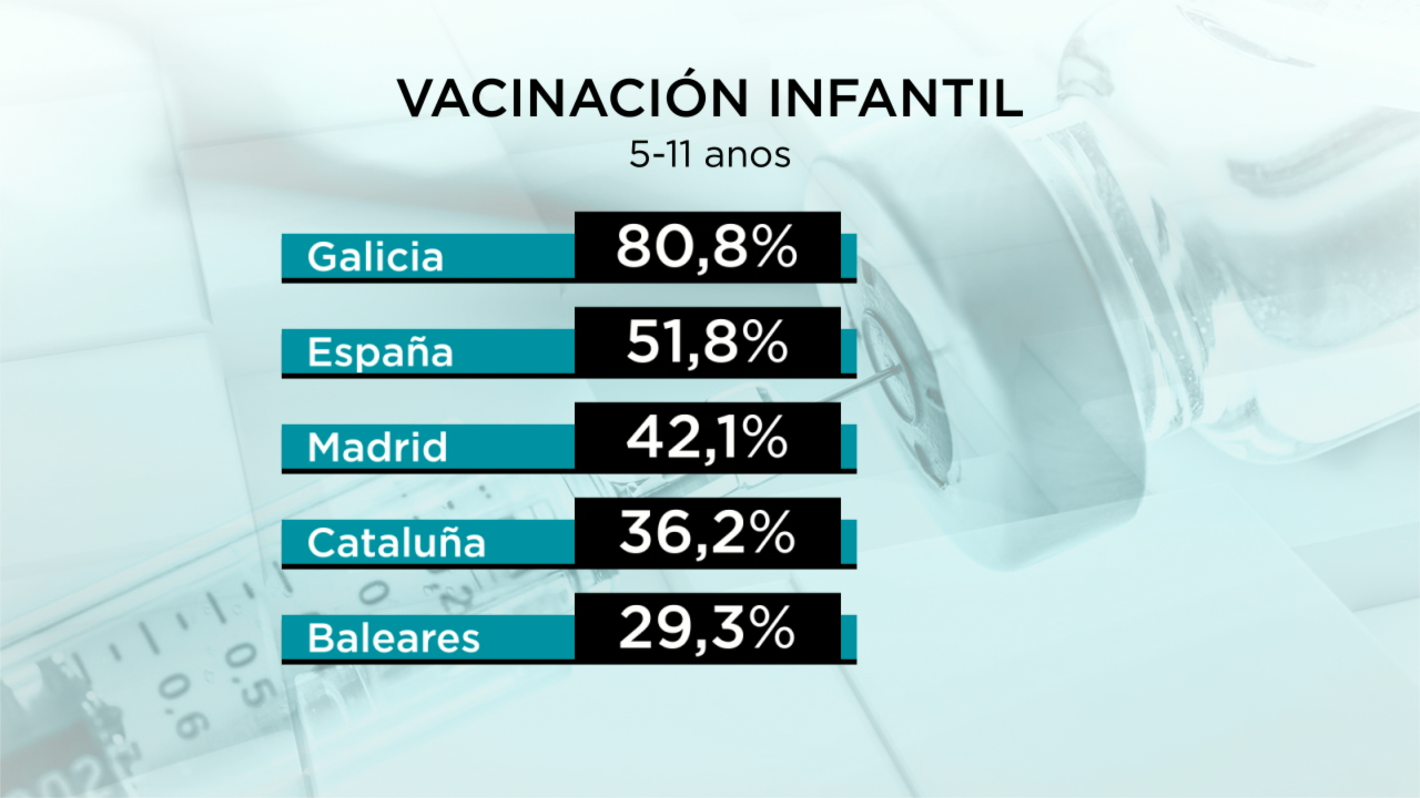 A vacinación infantil avanza a un ritmo lento e son moitas as comunidades que aínda non chegaron a esa fronteira do 50 %. Madrid está no 42 %, Cataluña no 36 % e Baleares, no derradeiro lugar, no 29 %.