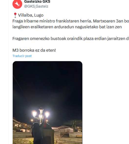 Este movemento xuvenil cun ideario de corte comunista ortodoxo acusa a Fraga nun texto, en eusquera, que acompaña ao vídeo de ser "un dos principais responsables do asasinato dos cinco traballadores", denuncia que o busto continúe no lugar e conclúe: "a loita m3 non cesou", en referencia aos sucesos do 3 de marzo de Vitoria.