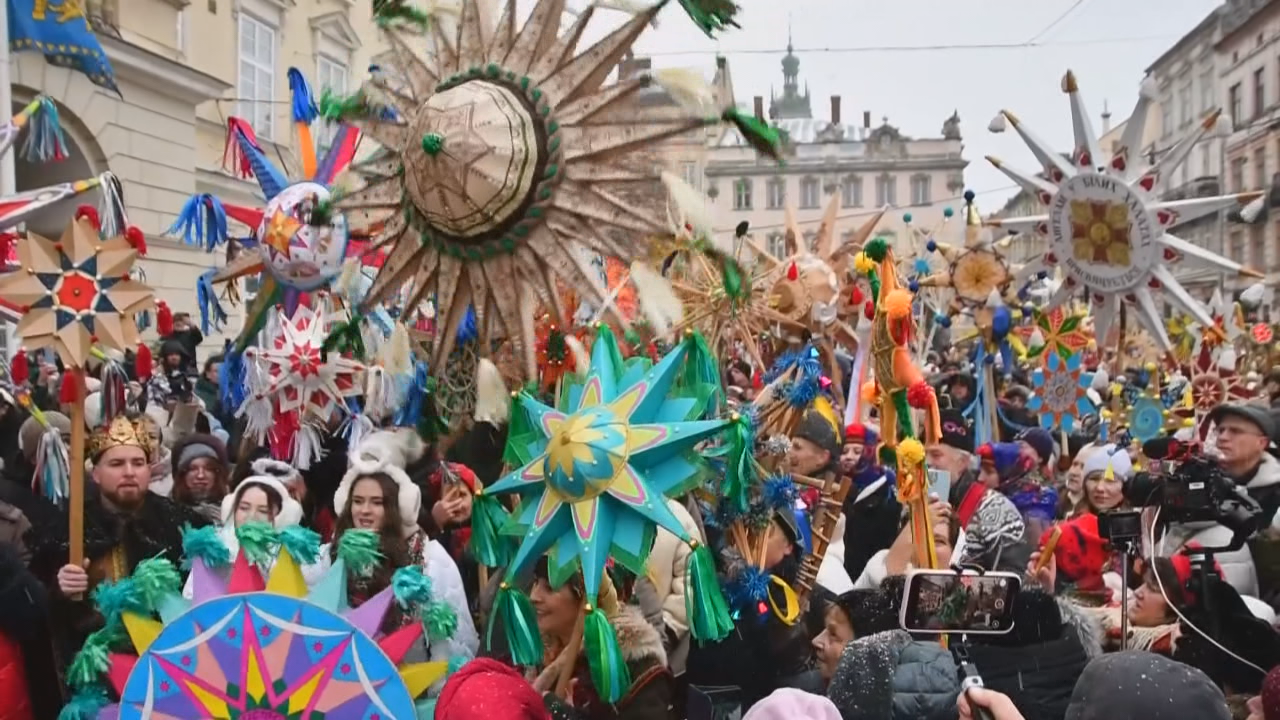 Moitos levan estrelas feitas a man, símbolos da Estrela de Belén, de madeira e de papel de cores, que son propias das tradicións cristiás e populares de Ucraína.