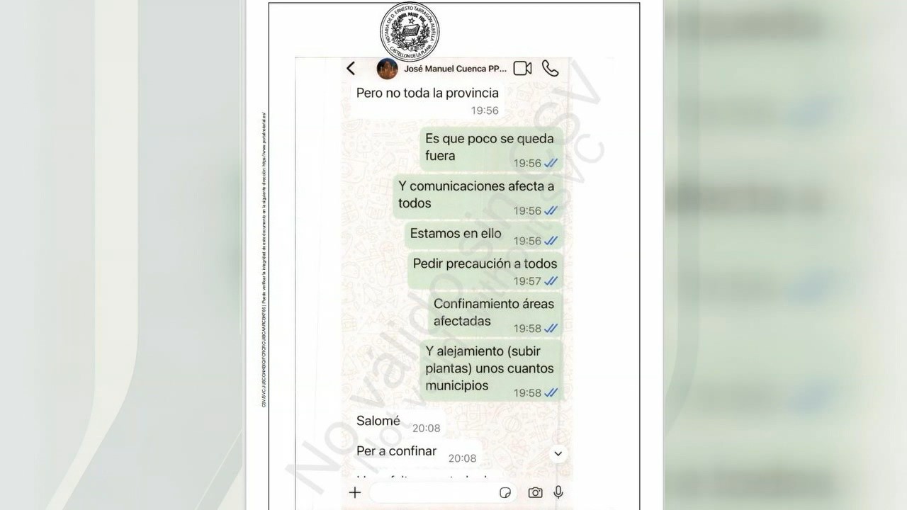 Pradas, que é unha das imputadas, propuxo confinar a poboación e pedir que a xente se desprazase ás zonas altas dos edificios. Cuenca descarta esa posibilidade e indícalle que unha decisión dese tipo é competencia do Goberno. A conselleira tamén informa o expresidente Mazón da gravidade da situación na localidade de Utiel.