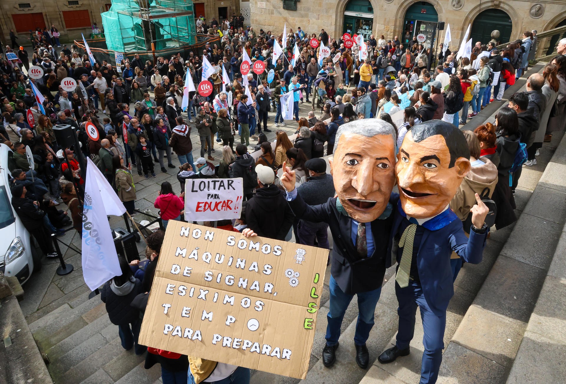 En Santiago a manifestación, tamén concorrida, partiu da Alameda con dirección ao Obradoiro e no punto de saída Laura Arroxo, a secretaria nacional de CIG Ensino, comentou que nunha cidade e noutra, do mesmo xeito que en Vigo, que acolleu outra acción similar esta semana, reman na mesma dirección, que é sobre todo a de recuperar "dereitos arrebatados" e "alcanzar outros".