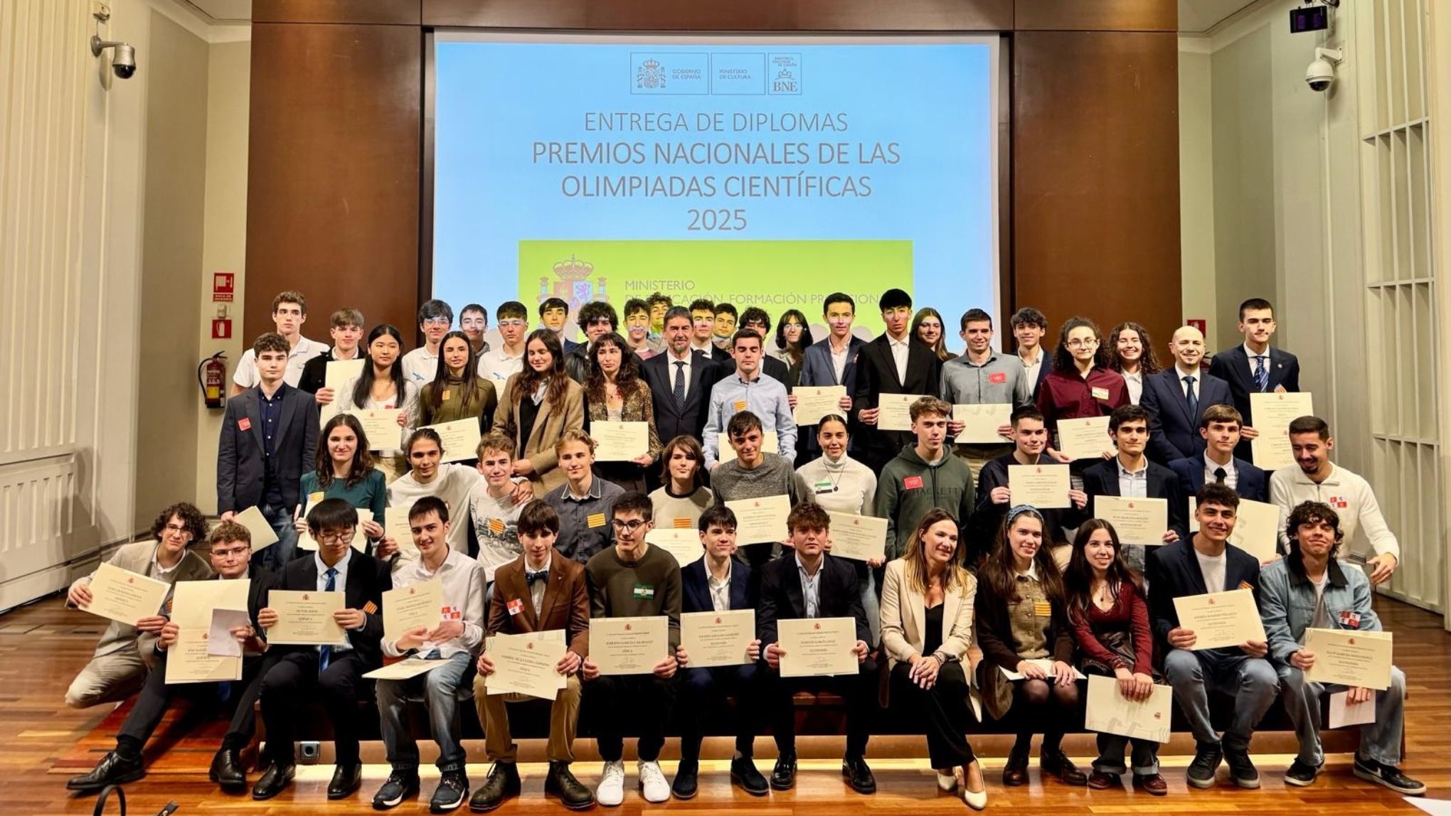 Un total de 71 estudantes de 3º e 4º de ESO e de 1º e 2º de bacharelato recibiron este venres na Biblioteca Nacional de Madrid, os premios nacionais das Olimpíadas Científicas 2025 e o recoñecemento do Ministerio de Educación polos seus éxitos nas fases internacional e iberoamericana destas competicións.