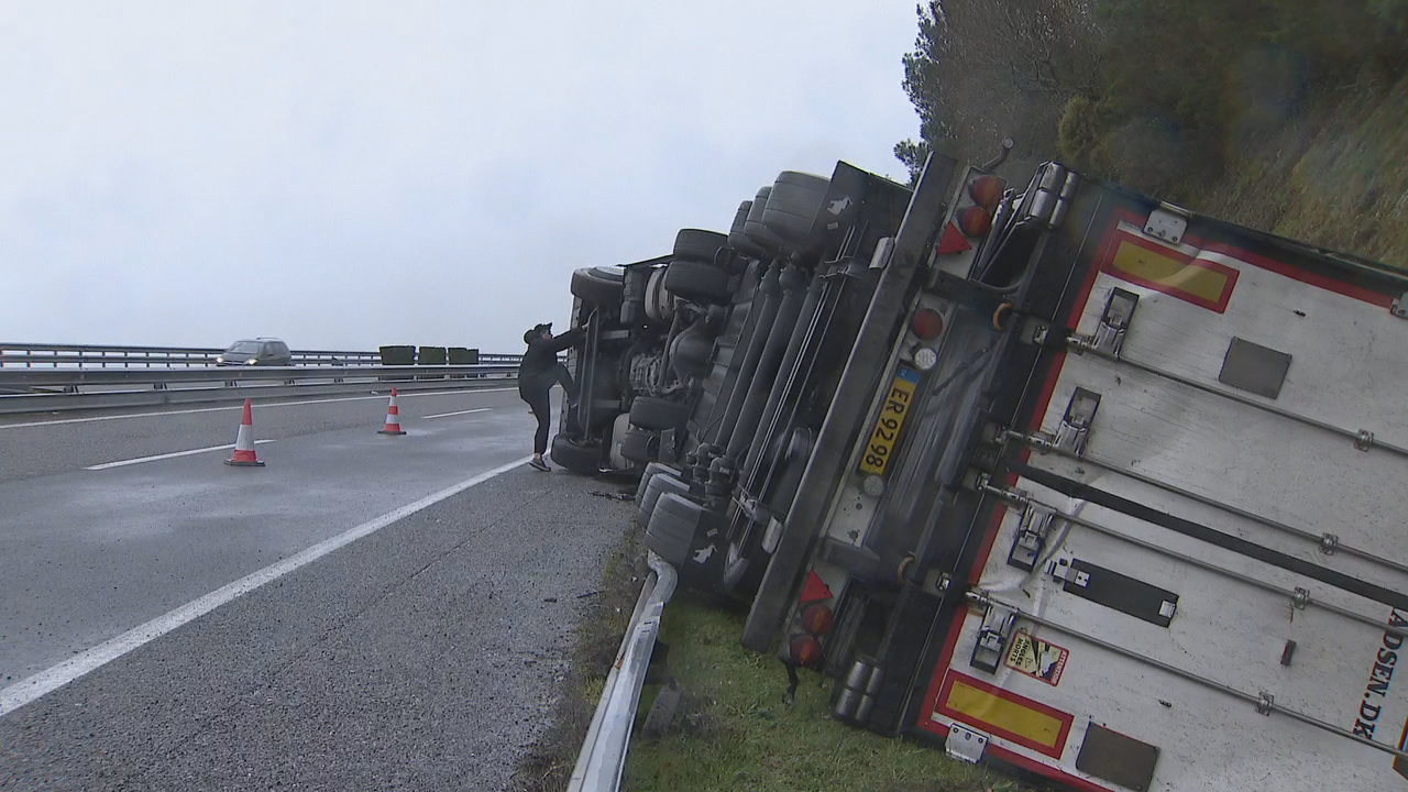 Un camión complica a circulación na A-6 tras envorcar preto do túnel de Neira